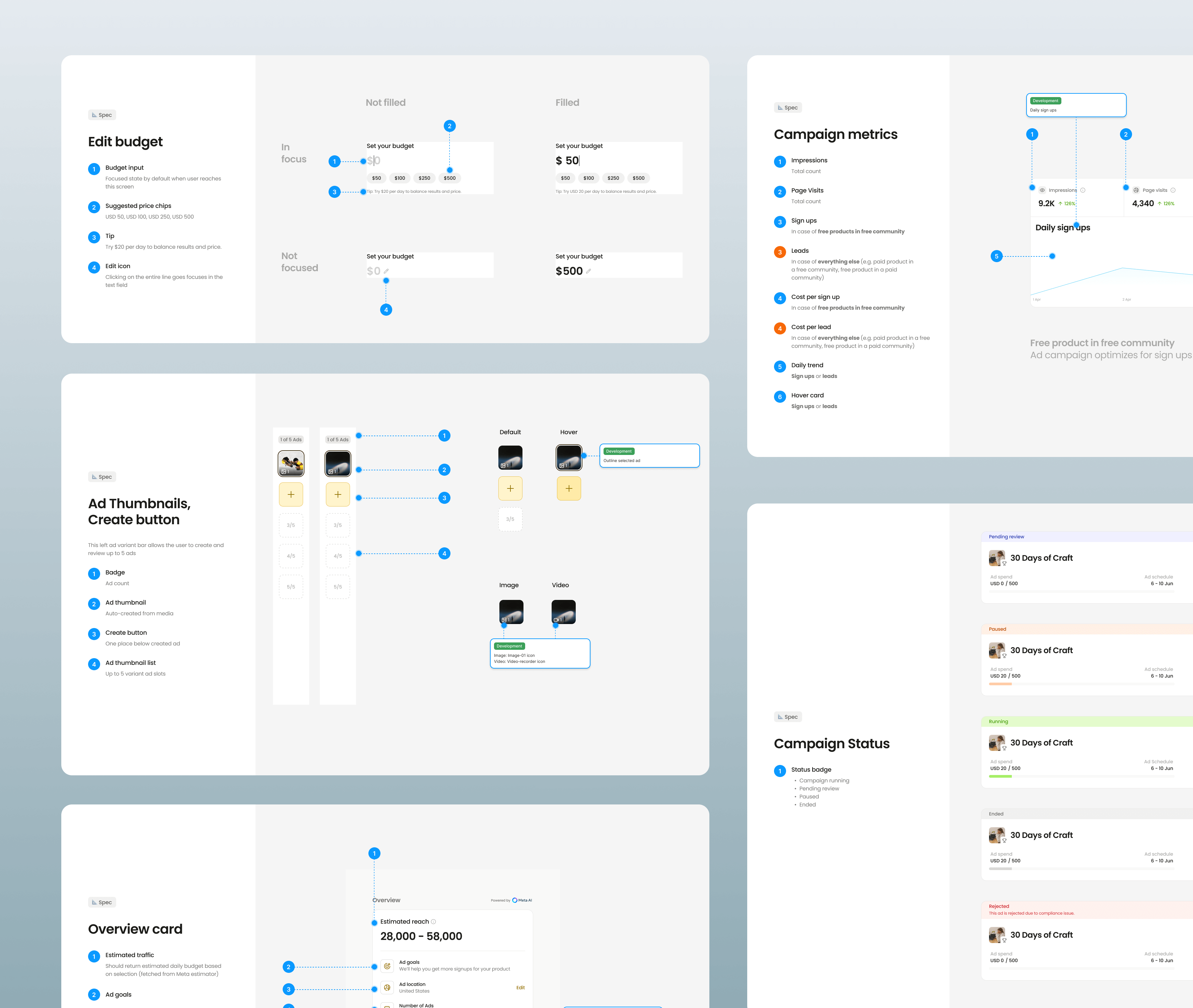 Meta Ads Manager and competitors lead with audience targeting and budgets. I reversed this, starting with creative ad building instead. This matched both user behavior and our internal workflow—people create content first, then consider promotion costs. The result felt more intuitive and less intimidating for first-time advertisers.