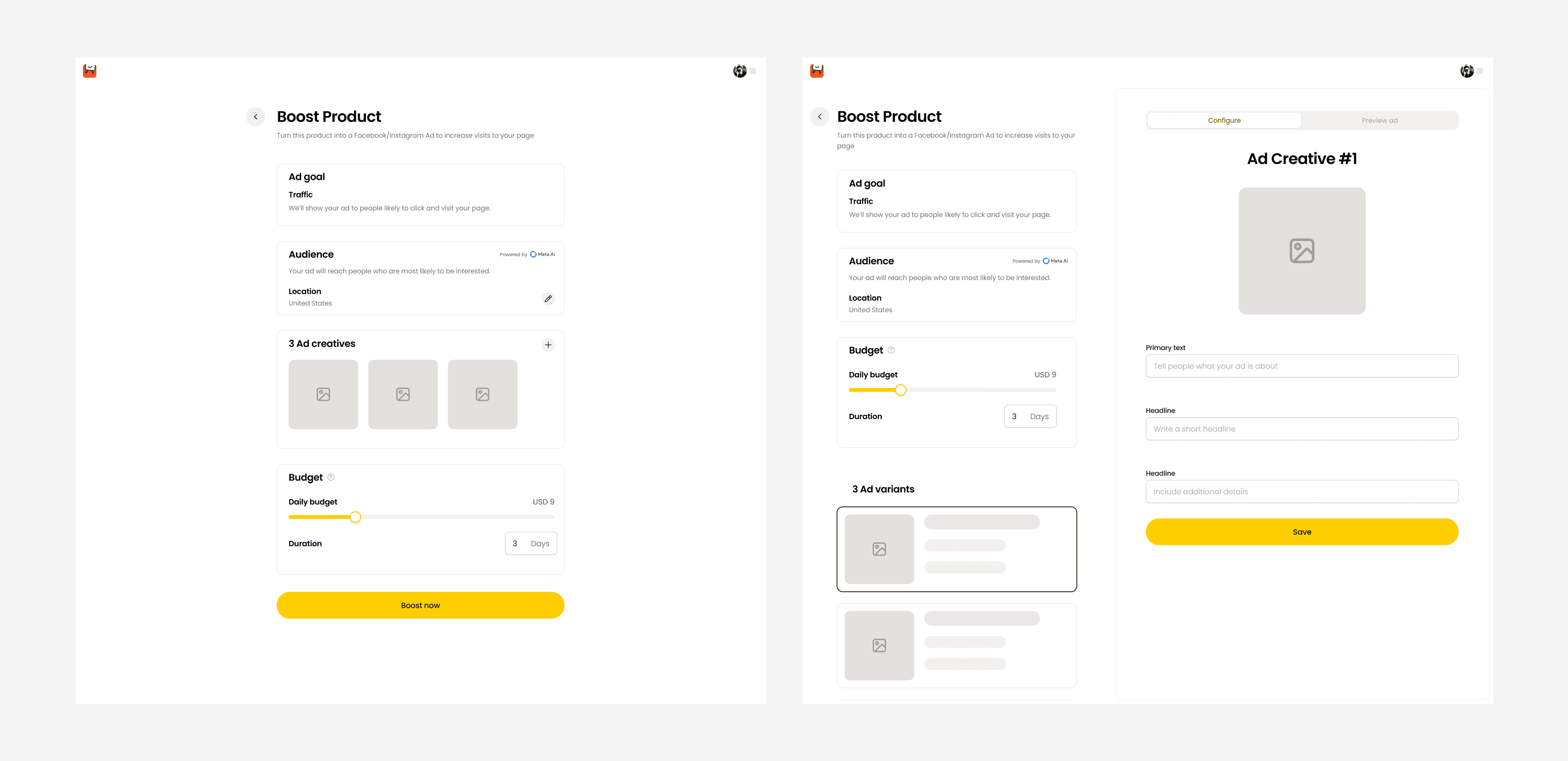 Click "Boost" to transform the product into an ad. I worked closely with our engineer to perfect the transition animation and loading state, creating a moment of delight rather than waiting. The first ad comes pre-populated, allowing users to launch immediately or customize as needed.