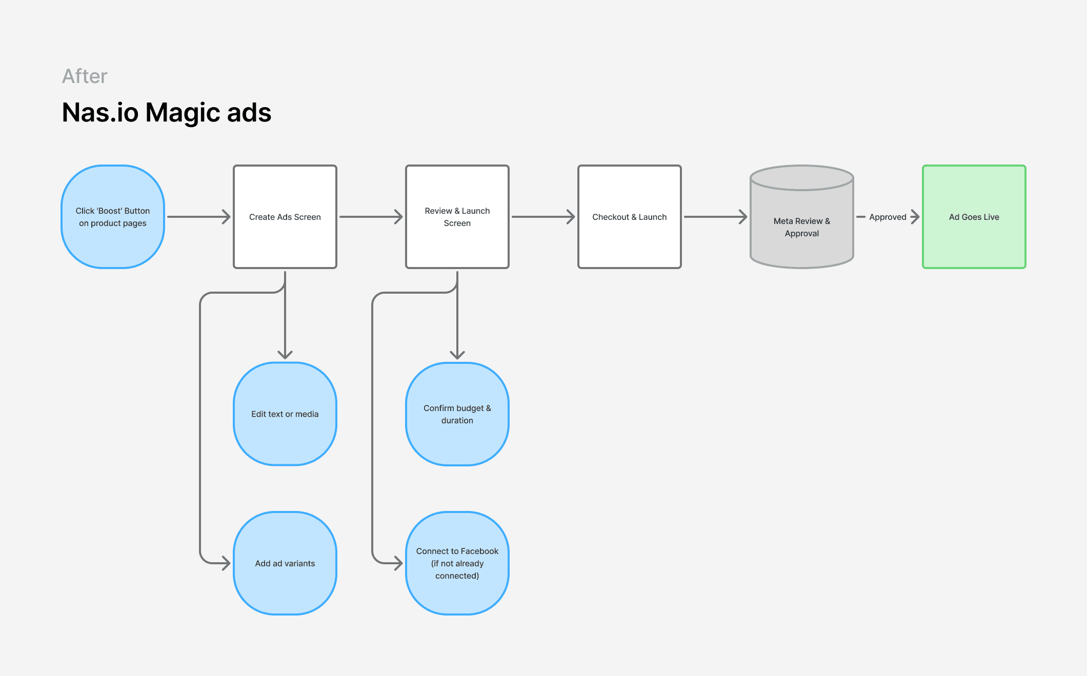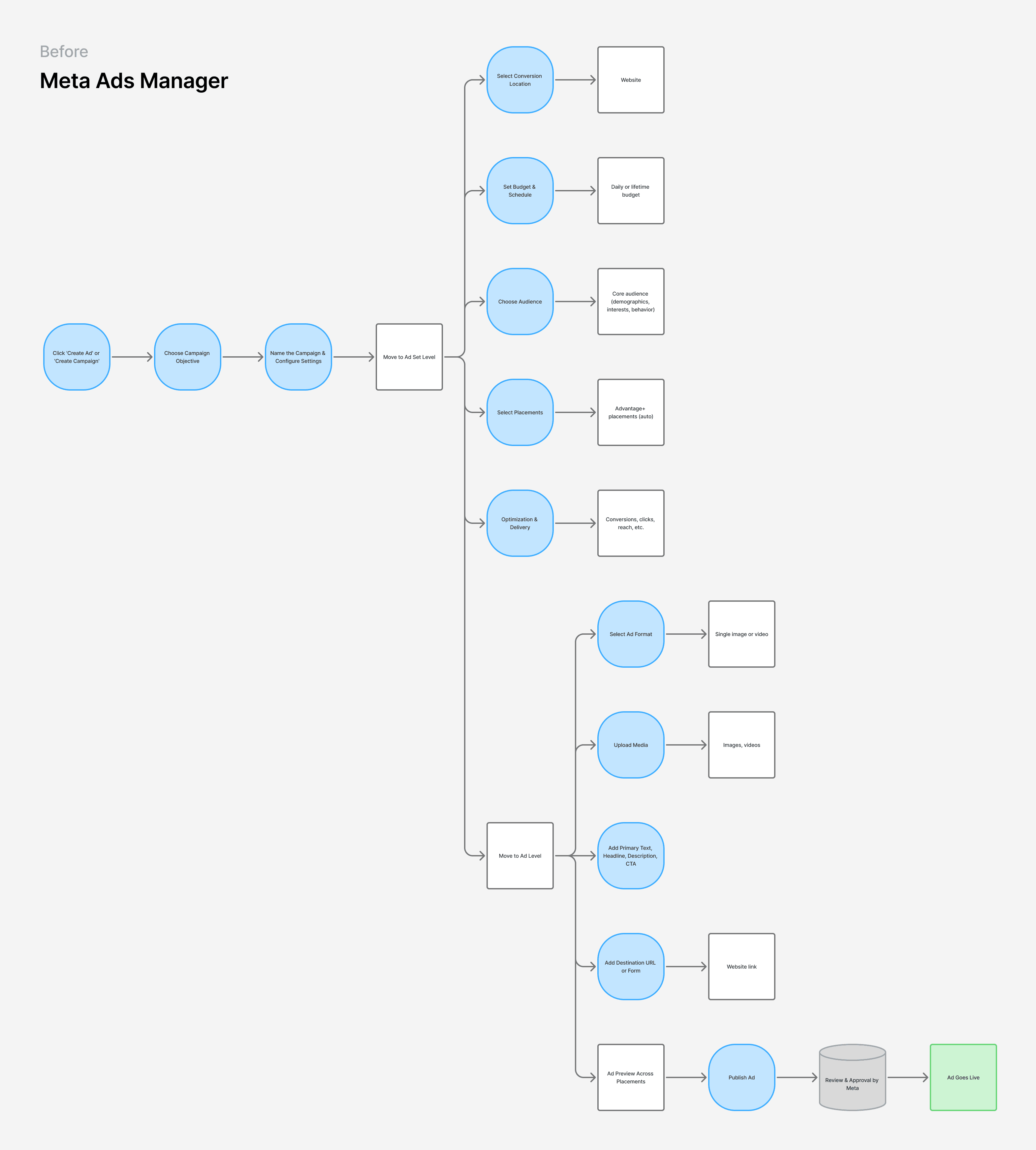 To simplify the experience, I immersed myself in Meta Ads Manager, working closely with our performance marketer to understand what makes an effective ad campaign. This research phase consumed most of our timeline but was essential to reimagining the user flow and abstracting away unnecessary complexity.