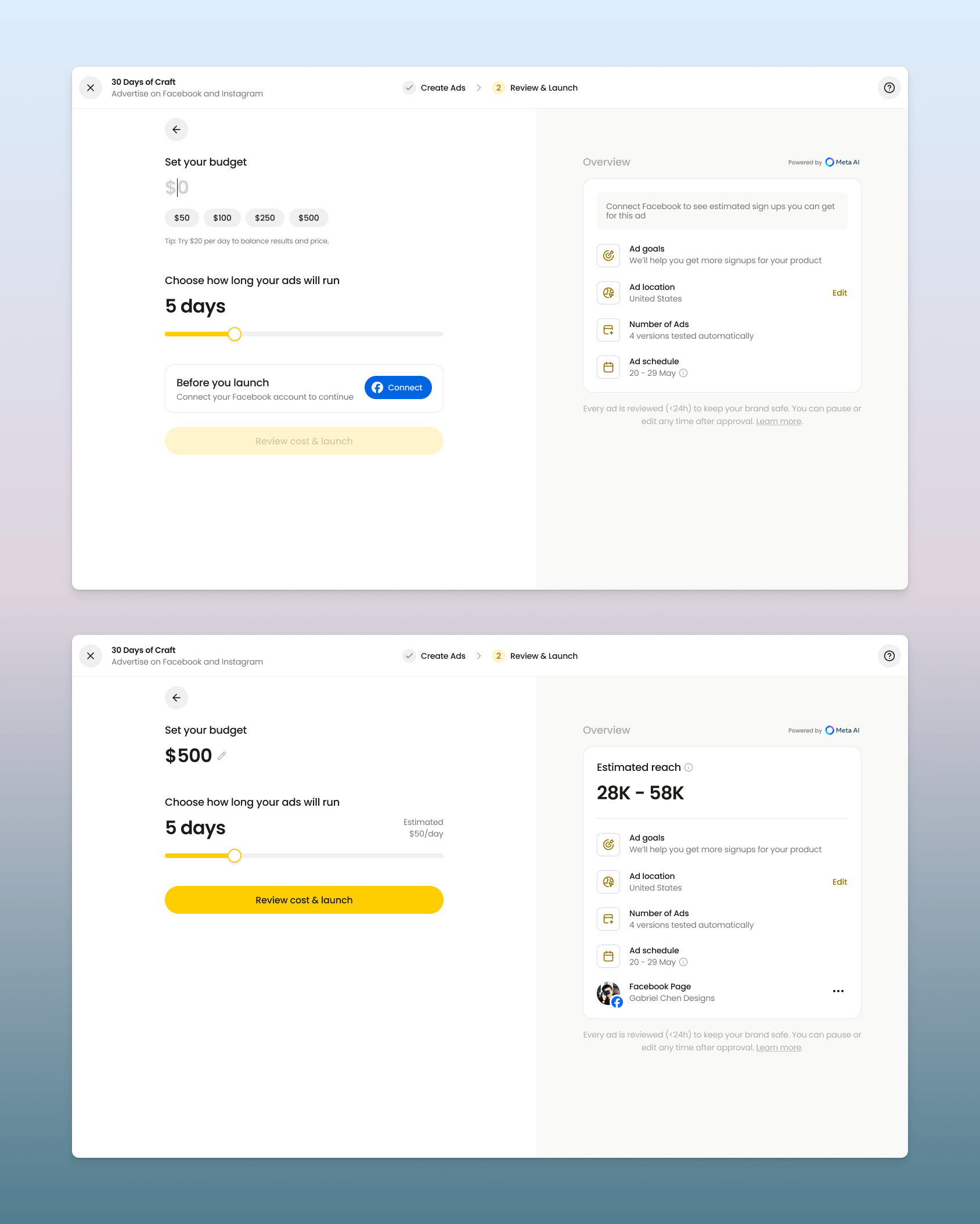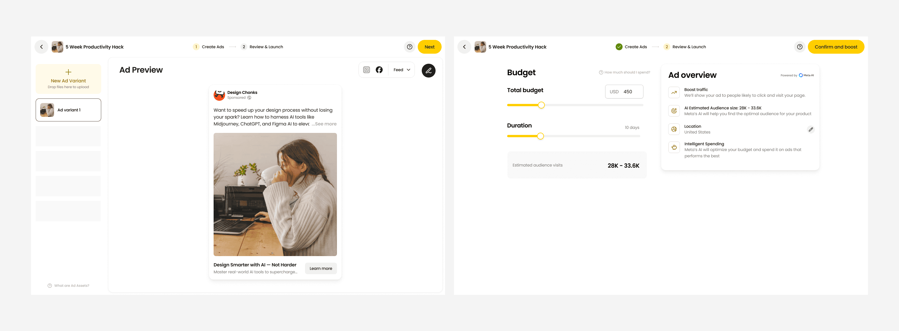 Two-step split: Separating ad creation from campaign budget provided clear focus areas while maintaining simplicity.